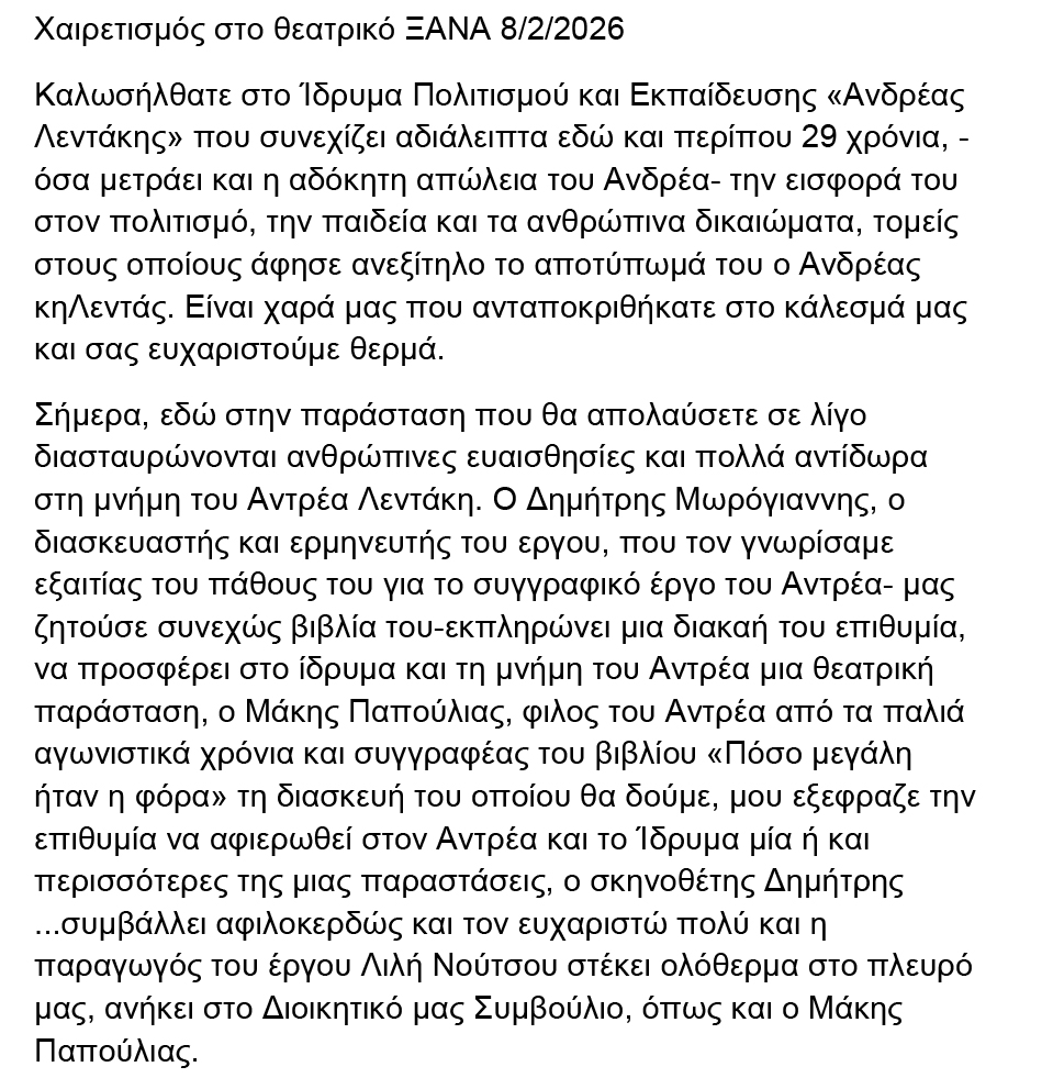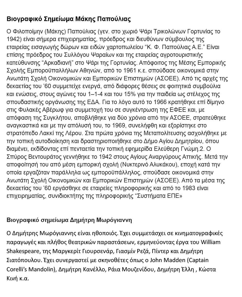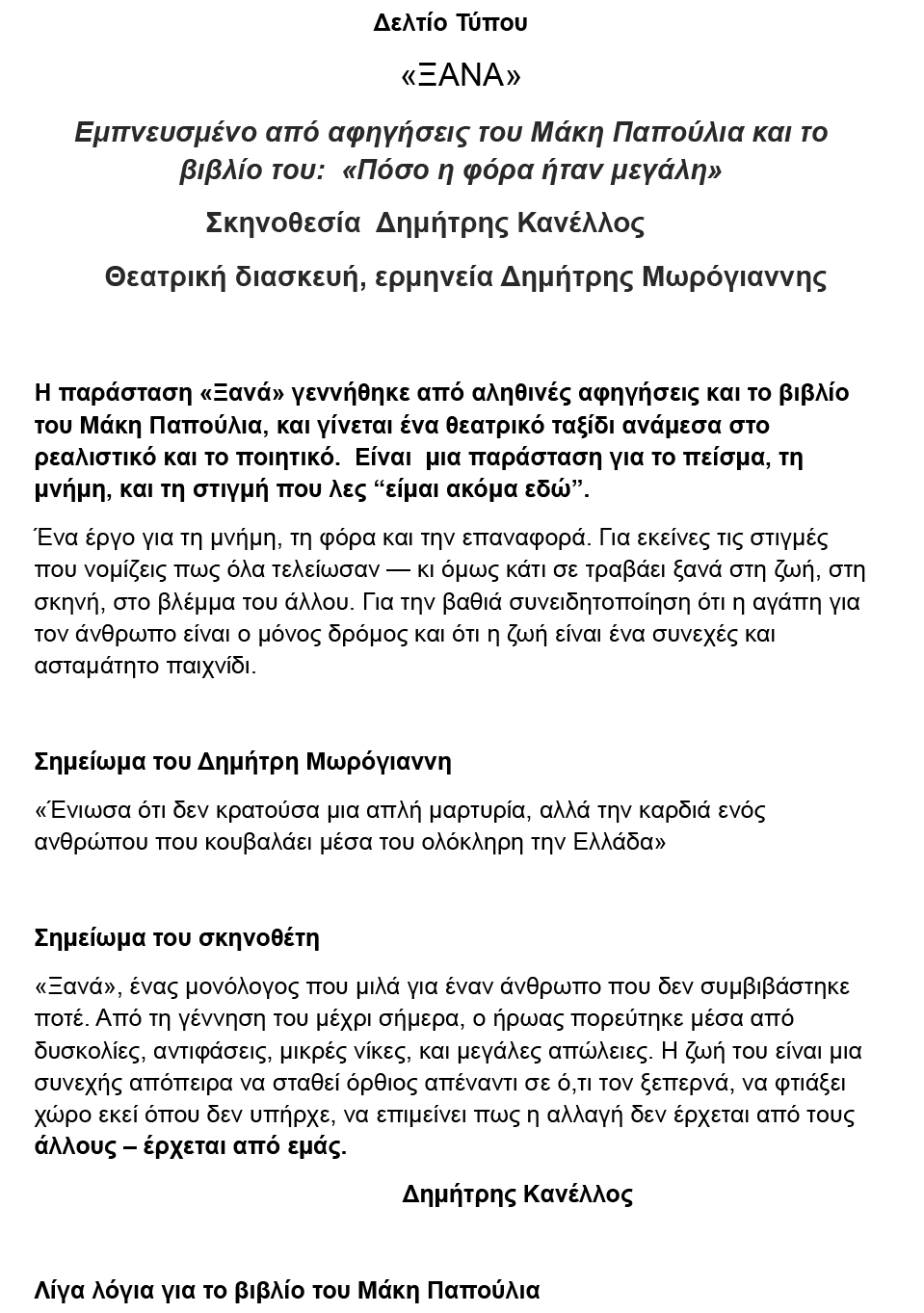 Ο Θεατρικός Μονόλογος που καθηλώνει τον θεατή, εμπνευσμένος από το βιβλίο”Πόσο η φόρα ήταν μεγάλη” του Μάκη Παπούλια. Ο Δημήτρης Μωρόγιαννης ξανασυστήνεται στον καλλιτεχνικό χώρο και το θεατρικό κοινό μετά από απουσία με τη στιβαρή του διασκευή και ερμηνεία διατρέχοντας μια εποχή με δύσμορφα τοπία και καταστάσεις.